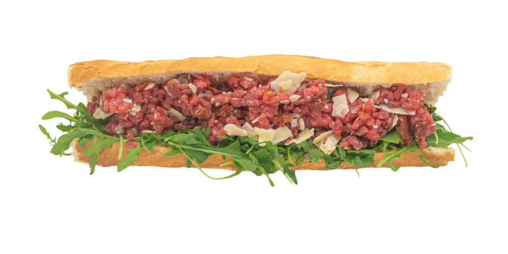 Américain nature, parmesan, pesto, cressonnette, pignons de pin, sel et poivre.